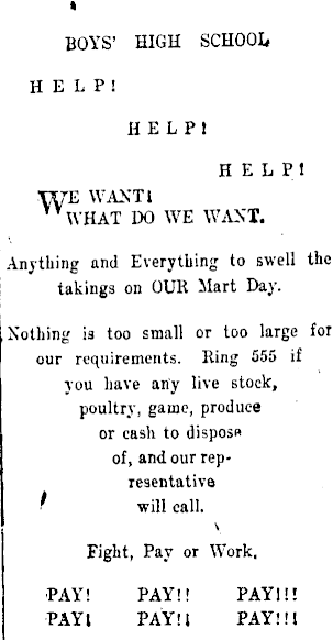 BOYS' HIGH SCHOOL T*7E WANT I YV WHAT DO WE WANT. Anything and Everything to swell the takings on OUR ilart Day. [Nothing is too small or too large for our requirements. Ring 555 if you have any live stock, poultry, game, produce or cash to dispose of, and our representative Fight, Pay or Work,