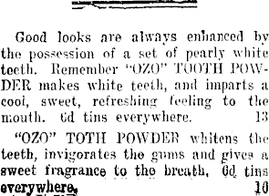 Good looks nre always enhanced by the possession of a set of pearly white toeth. Remember "OZO" TOOTH POWDKR makes white teeth, and imparts a cool, sweet, refreshing feeling to the mouth, tid tins everywhere. 13 "OZO" TOTH POWDER whitens the teeth, invigorates the gums and pives a sweet fragrance to the breath, o<i tins OToywher* JO