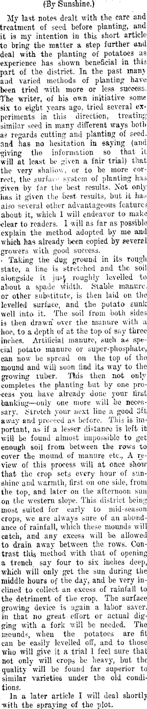 (■By Sunshine.) My last notes dealt with the care and treatment of seed before planting, and it is my intention in this short article to bring the matter a step further and deal with the planting of potatoes as experience has shown beneficial in this part of the district. In the past many and varied methods of planting have been tried with more or less success. The writer, of his own initiative some six to eight years ago, tried several experiments in this direction, treating similar seed in many different ways both as regards cutting and planting of seed, and has no hesitation in saying (and giving the information so that- it will at least be V en a fair trial) that the very shallow, or to be more correct, the surfai-.' system of planting luu given by far the best results. Not only lias it given the best results, but it lia« also several other advantageous features about it, which I will endeavor to make clear to readers. I will as far as possible explain the method adopted by me and which has already l>cen copied by several growers with good success. • Taking the dug ground in its rough state, a line is stretched and the soil alongside it just roughly levelled to about a spade width. Stable manure, or other substitute, is then laid on the levelled surface, and the potato sunk well into it. The soil from both sides is then drawn over the manure with a hoe, to a depth of at the top of say three inches. Artiiicial manure, .such as special potato manure or super-phosphate, can now be spread on the top of the mound and will soon find its way to the growing tuber. This then not only completes the planting but by one pro•cess you have already done your first banking—only one more will be necessary. Stretch your next line a good 3ft away and proceed as before. This is important, as if a lesser distance is left it will be found almost impossible to get enough soil from between the rows to cover the mound of manure etc., A review of this process will at once show that the crop sets every hour of sunshine and warmth, first on one side, from the top, and later on the afternoon sun on the western slope. This district being most suited for early to mid-season crops, we are always sure of an abundance of rainfall, which these mounds will catch, and any excess will be allowed to drain away between the rows. Contrast this method with that of opening a trench, say four to six inches deep, which will only get the sun during the middle hours of the day, and be very inclined to collect an excess of rainfall to the detriment of the crop. The surface growing device is again a labor saver, in that no great effort or actual digging with a fork will be needed. The mounds, when the potatoes are fit can be easily levelled off, and to those who will give it a trial 1 feel sure that not only will crops be heavy, but the quality will be found far superior to similar varieties under the old conditions. In a later article I will deal shortly •with the spraying of the plot.