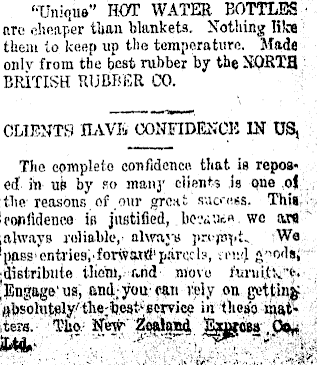 '•Unique" HOT WATER BOTTLES arc cheaper titan blankets. Nothing like : them to keep up the temperature. Made onlv from the best rubber by the XQKTfI BRITISH RUBBER CO. CLIENTS lIAVIi <X)NFIDESCB IN US, Tlio complete confidence that is repoa« , etf itt uk by so many clients is Que oj :the reasons of .our grout sucess. Thta, ! confidence iB justified, bo.v.ir.« . wc ms iftlways reliable, always 'Wa 'pass "entrieai'forw&rtf'parcel?, ;c:'l t hem,. r»nd move turuilvt. lEngage'us, and you oan vely on getting sbsohitely'tlie.-ljest' service m thes'o matiters.' l-lio- Sw ZofJajd jEggcsa ; po*