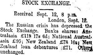 J STOCK EXCHANGE. Received Sept. 12, 8 p.m. London, Sept, 12. The Russian crisis has depressed' the Stock Exchange. Banks shares! Atts« tralasia £llß 17b 6d; National Auatrali asia £95; New Zealand £7B 10#i'Net4 Zealand loan debentures ,£7l. OtiKML unchanged. —■