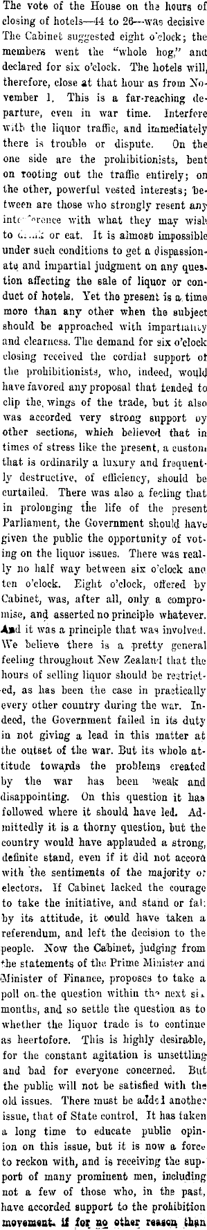 The vote of the House on tha hours of closing of hotels—44 to 26—was decisive The Cabinet suggested eight o'clock; the members went the "whole hog," and declared for six o'clock. The hotels will, therefore, close at that hour as from November 1. This is a far-reaching departure, even in war time. Interfere with the liquor traffic, and immediately there is trouble or dispute. On the one side are the prohibitionists, bent on rooting out the traffic entirely; on the other, powerful vested interests; between are those who strongly resent any intr-""ranee with what they may wish to Ci or eat. It is almost impossible under such conditions to get a dispassionate and impartial judgment on any question affecting the sale of liquor or conduct of hotels. Yet tho present is a, time moro than any other when the subject should be approached with impartiality and clearness. The demand for six o'clock closing received the cordial support ot the prohibitionists, who, indeed, would have favored any proposal that tended to clip the. wings of the trade, but it also was accorded very strong support oy other sections, which believed that in times of stress like the present, a custom that is ordinarily a luxury and frequently destructive, of efficiency, should be curtailed. There was also a feeling that in prolonging tile life of the present Parliament, the Government should have given the public the opportunity of voting on the liquor issues. There was really no half way between six o'clock ano ten o'clock. Eight o'clock, ottered by Cabinet, was, after all, only a compromise, and asserted no principle whatever. Aad it was a principle that was involved. We believe there is a pretty general feeling throughout New Zealand that the hours of selling liquor should be restricted, as has been the case in practically every other country during the war. Indeed, the Government failed in its duty in not giving a lead in this matter at the outset of the war. But its whole attitude towards the problems created by the war has been 'weak and disappointing. On this question it has followed where it should have led. Admittedly it is a thorny question, hut the country would have applauded a strong, definite stand, even if it did not accord with the sentiments of the majority of electors. If Cabinet lacked the courage to take the initiative, and stand or fa I: by its attitude, it oeuld have taken a referendum, and left the decision to the people. Now the Cabinet, judging from the statements of the Prime Minister and Minister of Finance, proposes to take a poll on-the question within th-> next si* months, and so settle the question as to whether the liquor trade is to continue as heertofore. This is highly desirable, for the constant agitation is unsettling and bad for everyone concerned. But the public will not be satisfied \vith the old issues. There must be addcl another issue, that of State control. It has taken a long time to educate public opinion on this issue, but it is now a fore* to reckon with, and is receiving the support of many prominent men, including not a few of those who, in the past, have accorded support to the prohibition - mev«ia«at> if for. no other mica thsn