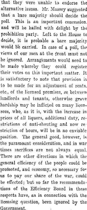 that they were unable to endorse the alternative issues. Mr. Massey suggested that a bare majority should decide the poll. This is an important concession, and will be hailed with delight by the prohibition party. Left to the House to decide, it is probable a bare majority would be carried. In case of a poll, the views of our men at the front must not be ignored. Arrangements would need to be made whereby they could register their votes on this importaut matter. It is satisfactory to note that provision is to be made for an adjustment of rents, etc., of the licensed premises, as between landlords and tenants, otherwise grave hardship may be inflicted on many licensees, who, as it is, with the increase in prices of all liquors, additional duty, restrictions of anti-shouting and now restriction of hours, will be in no enviable position. The general good, however, h the paramount consideration, and in war times sacrifices are nob always equal. There are other directions in which, the .general efficiency of the people could be promoted, and economy, so necessary io r us to pay our share of the war, could be effected; tut so far the recommendations of the Efficiency Board in these respects have, as in connection with the licensing question, been ignored by the Government. i