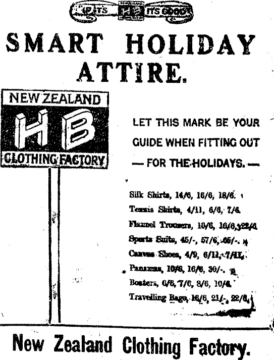 SMART HOLIDAY ATTIRE. I NEWZEALAND Hi raoTHiNftacTORY <J2 LET THIS MARK BE YOUR GUIDE WHEN FITTING OUT FOR THEHOLIDAYS. Silk Shirts, 14/6, 16/6, 16/6. t Tenets 4/11, 6/6, 774 numl Xraws, 10/6, Bp«rt» Safe, 46/-, 67/6,46/-. * Oufna Sfaoca, 4/9 3 6/Urf/lV< „ PaauanM, 10W, Barters, C/Bk-7/e, 8/6, 10/C'' Tiawfliflg 21/-, »/* New Zealand Clothing Factory.