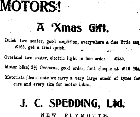 MOTORS! A 'Xmas am. Buick two seater, good condition, evarywlme a -fine little ct( £lB5, get a trial quick. , Overland two seater, electric light in fine order. £836. Motor bike; 3% Overseas, good order, first cheque at £l6 Ma. Motorists please note we carry a very large stock of tyrei fox cars and every size lor motor bikes. J. C. SPEDDING, Ltd. NEW PLYMOUTH.