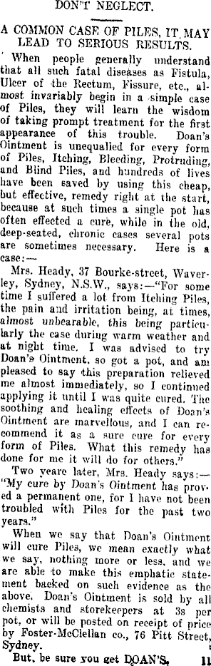 DON'T NEGLECT. A COMMON CASE OP PILES, IT MAY LEAD TO SERIOUS RESULTS. When people generally understand that all such fatal diseases as Fistula, Ulcer of the Rectum, Fissure, etc., almost invariably begin in a -simple case of Piles, they will learn the wisdom of taking prompt treatment for the first appearance of this trouble. Doan's Ointment is unequalled for every form of Piles, Itching, Bleeding, Protruding, and Blind Piles, and hundreds of lives have been saved by using this cheap, but effective, remedy right'at the start, because at such times a single pot lias often effected a curb, while in the old, deep-seated, chronic cases several pots are sometimes necessary. Here is a case:— Mrs. Heady, 37 Bourke-street, Waverley, Sydney, N.S.W., says:—"For some time I suffered a lot from Itching Piles, the pain and irritation being, at times', almost unbearable, this being particularly the case during warm weather and at night time. I was advised to trv Doan's Ointment, so got a pot, and am pleased to say this preparation relieved me almost immediately, so I continued applying it until I was quite cured. The soothing and healing effects of Bonn's Ointment are marvellous, and I can recommend it as a sure cure for every form of Piles. What this remedy has done for me it will do for others." Two veare later, Mrs. Heady says:— "My cure by Doan's Ointment has prov. Ed a permanent one, for I have not been troubled with Piles for the past two years." When we say that Doan's Ointment will cure Pilc3, we mean exactly what we say, nothing more or less, and we are able to make this emphatic statement backed on such evidence as the above. Doan's Ointment is sold by all chemists and storekeepers at 3s per pot, or will be posted on receipt of price by Foster-McClellan eo., 76 Pitt Street, Sydney. » But, be sure you get IRAN'S. 11