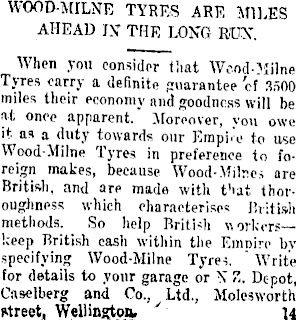 WOOD-MILNE TYRES ARE MILES AHEAD INT THE LONG RON. When you consider (hat Wood-Milne Tyres carry a definite guarantee cf 3500 miles their economy and goodness will be at once apparent. Moreover, von owe it as a duty towards our Empire to use Wood-Milne Tyres in preference to foreign makes, because AVood-Milres are British, and are made with that thoroughness which characterises British methods. So help British workers—keep British cash within the Eumire bv specifying Wood-Milne Tyres. ' Write for details to your garage or \ Depot, Caselberg and Co., Ltd., Molesworth rtreet, Wellington v 14