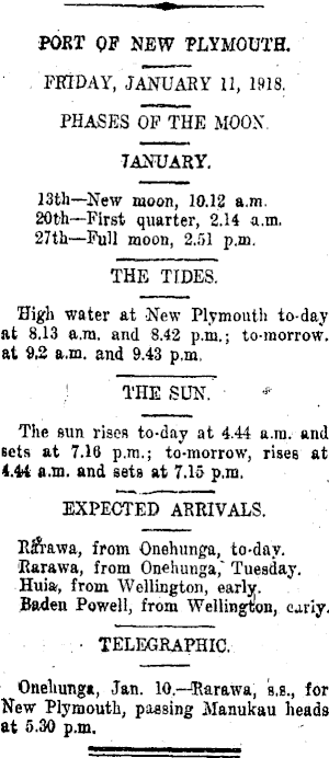 PORT OP NEW PLYMOUTH. , FRIDAY, JANUARY 11, 1918. PHASES OF THE MOON, 7ANUARY. 13th—New moon, 10.12 a.m. 20th—First quarter, 2.14 a.m. 27th —Full moon, 2.51 p.m. THE TIDES. High water at New Plymouth to-day rat 8.13 a.m. and 8.42 p.m.; to-morrow, at 9.2 a.m. and 9.43 p.m. THE SUN. The sun rises to-day at 4.44 a.m. and sets at 7.16 p.m.; to-morrow, rises at 4.44 a.m. and sets at 7.15 p.m. EXPECTED ARRIVALS. lUfrawa, from Onehunga, to-day. Rarawa, from Onehunga," Tuesday. Huia, from Wellington, earlyBaden Powell, from Wellington, early. • TELEGRAPHIC. Onelumgt, Jan. 10. —Rarawa, s.b., for New Plymouth, passing Manukau heads at 5.30 p.m.
