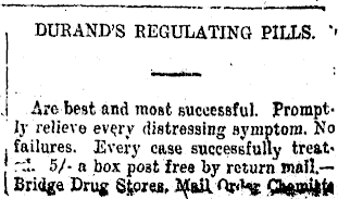 DURAND'S REGULATING PILLS. •. Are best and most successful. Prompti ly relieve every distressing symptom. No i,, failures. Every case successfully treatJ r~. 5/- a box post free by return mail.— I Bridge Drug Stores, Opt* Shfistittl