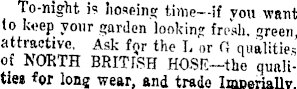 To-night is hoseing time—if you want to k<?ep your pardon looking fresh, green, attractive. Ask f<jr the Lor 0 qualities of NORTH BRITISH HO-SE—the qualities for long wear, and trade Imperial!?.