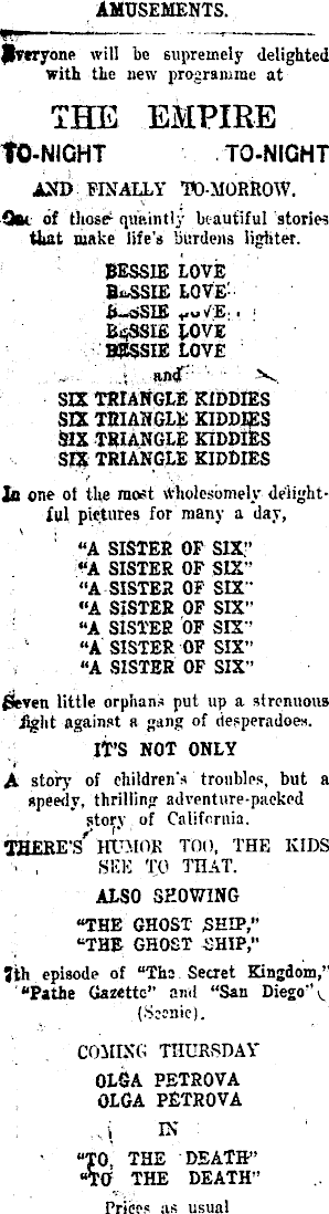 AMUSEMENTS. JHeryone will be supremely delighted with the new programme at THE EMPIRE tO-NIGHT TO-NIGHT AXD FINALLY TO-MORROW. Cki of quaintly beautiful stories that make life's burdens lighter. BESSIE LOVE BESSIE LOVE6~c>SIE * 1 BijjSSIE LOVE BESSIE LOVE .... ...j.'.-.-jmdF - " ' -V. SIX TRIANGLE KIDDIES SIX TRIANGLE KIDDIES Six triangle kiddies SIX TRIANGLE KIDDIES lo one of the most Wholesomely delightful pictures for many a day, : "A SISTER OP SIX;' "A SISTER OF SIX" "A SISTER OF SIX" "A SISTER OF SIX" "A SISTER OF SIX" "A SISTER OF SIX" "A SISTER OF SIX" £jeveti little orphans put up a strenuous %ht against a gang of desperadoes. IT'S NOT ONLY A story of children's tronblps, but a upeedy, thrilling adventure-packed story of California. 'HUMOR TOO, THE KIDS . , SEE TO THAT. ALSO SHOWING "THE GHOST SHIP," "THE GHOST SHIP," Jth episode of "Ths. Secret Kingdom," "Pathe Gazette" and "San Diego" v (Seonic). COMING THURSDAY OLGA PETROVA OLGA PETROVA ~ i IN : • "TO, THE DEATH" "TO THE DEATH" Prices as usual
