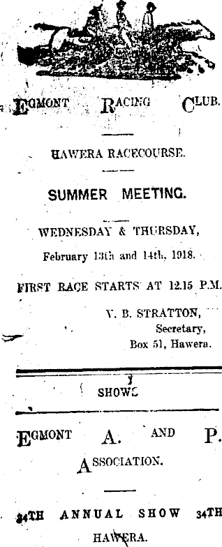 jjjJGMOKT JJACING £LUB. HAWERA RACECOURSE. SUMMER MEETING. WEDNESDAY & THURSDAY, February l.'tt'n and 14tli. 1918. fITtPT RACE STARTS AT 12.15 P.M. Y. B. STRATTON, '. Secretary, Box 51, Hawera. ISHOWC •JJGMONT i Y. AND P. ASSOCIATION. |«SB ANNUAL SHOW 34TH haaVera.