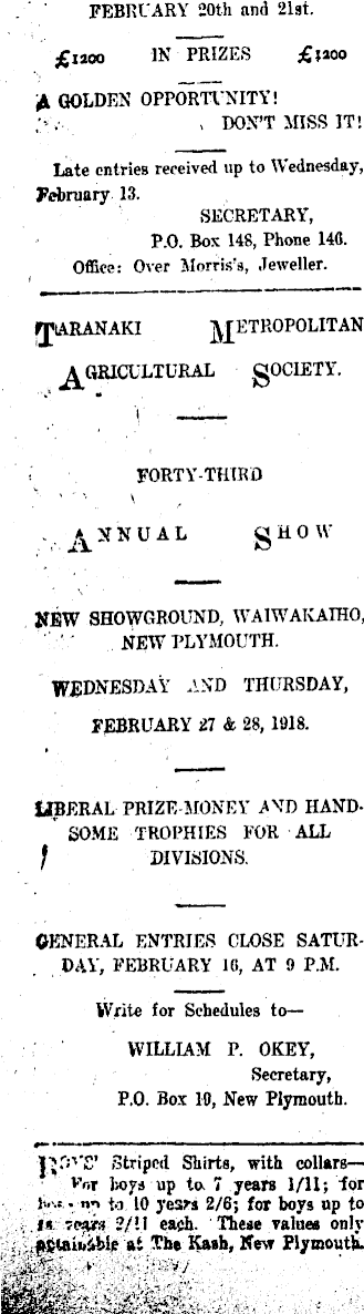 FEBRUARY 20th and 21at. £uoo IN PRIZES £jaoo fi. GOLDEN OPPORTUNITY! Late cntrieß received up to Wednesday, February 13. SECRETARY, P.O. Box 148, Phone 140. Office: Over Morris's, Jeweller. AGRICULTURAL gOCIETY. FORTY-THTRO NEW SHOWGROUND, WAIWAKAIHO, " NEW PLYMOUTH. WEDNESDAY AN'D THURSDAY, FEBRUARY £1 &. 28,1918. UffiERAL PRIZE-MONEY AVD HAND- ' SOME TROPHIES FOR ALL j DIVISIONS. GENERAL ENTRIES CLOSE SATURDAY, FEBRUARY 10, AT 9 P.M. Write for Schedules to — WILLIAM P. OKEY, Secretary, P.O. Box 19, New Plymouth. | Striped Shirts, with collars— Vr.r boys up to. 7 years 1/H; "for . nn to 10 yes« 2/6; for boys up to f« ?/!! each. These values only ; at The Kash, Kevr Plymouth. > DON'T MISS IT! IJIARANAKI METROPOLITAN gHOW IflfrlV-