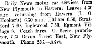 Daily News motor car services from New Plymouth to Hawera: Leaves 4.30 ii.ir.. returniiifj from Hawera (L. 0. Hookers) fi.so a.ra , Eltham 0.50, Stratford 720, Inglewood 7.50, Egmont Village S. Coac'ii fi'.res. G. Becrc, proprietor, f-il-l Devon Street East, New Plymouth. Pliocc 2.K.—Acivt.