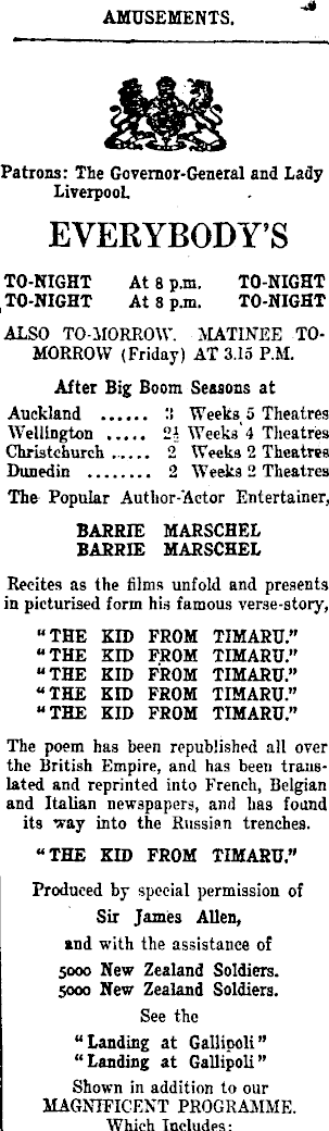 AMUSEMENTS. Patrons: The Governor-General and Lady Liverpool. EVERYBODY'S TO-NIGHT At 8 p.m. TO-NIGHT TO-NIGHT At 8 p.m. TO-NIGHT ALSO TO-MORROW. MATINEE TOMORROW (Friday) AT 3.15 P.M. After Big Boom Seasons at Auckland '.'• Weeks 5 Theatres Wellington 2i Weeks' 4 Theatres Christchurch 2 Weeks 2 Theatres Dunedin 2 Weeks 2 Theatres The Popular Author-Actor Entertainer, BARRIE MARSCHEL BARRIE MARSCHEL Recites as the films unfold and presents in picturised form his famous verse-story, -THE KID FROM TIMARU." "THE KID FROM TIMARU." "THE KID FROM TIMARU." "THE KID FROM TIMARU." "THE KID FROM TIMARU." The poem has been republished all over the British Empire, and has been translated and reprinted into French, Belgian and Italian newspapers, and has found its way into the Russian trenches. "THE KID FROM TIMARU." Produced by special permission of Sir James Allen, and with the assistance of 5000 New Zealand Soldiers. 5000 New Zealand Soldiers. See the "Landing at Gallipoli" "Landing at Gallipoli" Shown in addition to our MAGNIFICENT PROGRAMME. Which Includes: