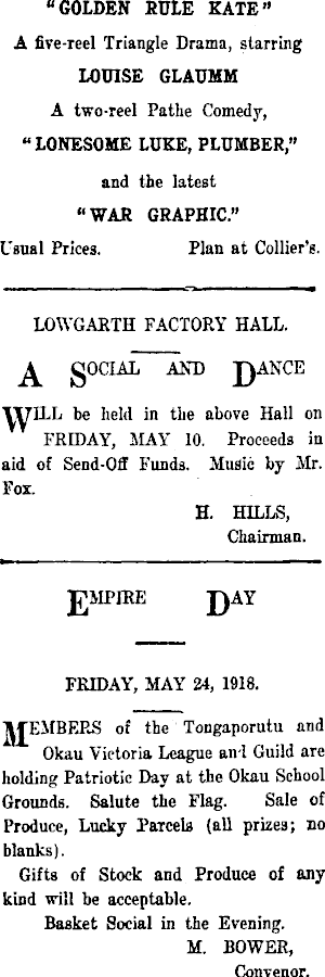 "GOLDEN RULE KATE" A five-reel Triangle Drama, starring LOUISE GLAUMM A two-reel Patlie Comedy, "LONESOME LUKE, PLUMBER," and the latest 'WAR GRAPHIC Plan at Collier's. LOWGARTH FACTORY HALL. A OOCIAL AND |~)ANCE VVILL be held In the above Hall on FRIDAY, MAY 10. Proceeds in aid of Send-Off Funds. Music by Mr. Fox. H. HILLS, Chairman. FRIDAY, MAY 24, 1918. ITEMBERS of the Tongaporutu and Okau Victoria League an-l Guild are holding Patriotic Day at the Okau School Grounds. Salute the Flag. Sale of Produce, Lucky Parcela (all prizes; no blanks). Gifts of Stock and Produce of any kind will be acceptable. Basket Social in the Evening. M. BOWER, Convenor.