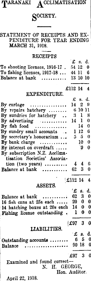 ARANAKI A CCLIMATISATION STATEMENT OF RECEIPTS AND EX- I PENMTURE FOR YEAR ENDING MARCH 31, 1918. RECEIPTS £ s. d. To shooting licenses, 1916-17 . 54 12 0 To fishing licenses, 1917-18 ... 44 11 6 Balance at bank 13 10 1" EXPENDITURE. £ a. d. By cartage 14 2 9 By Tepairs hatchery 0 10 11 By sundries for hatchery .. 3 18 By advertising 14 1 0 By fish food 14 0 By sundry small accounts .. 1 12 G By secretary's honorarium . ...■ 5 5 0 By bank charge 10 0 By interest on overdraft 9 0 By subscription N.Z. Acclimatisation Societies' Association (two years) 4 4 6 Balance at bank 62 3 0 !£ll2 14 4 ASSETS. '£ 8. d. Balance at bank 62 3 0 16 fish cans at 25s each 20 0 0 14 hatching boxes at 20s each 14 0 0 i Fishing license outstanding . 10 0 LIABILITIES. £ 8. d. Outstanding accounts 6 5 0 Balance 90 18 0 £97 3 0 Examined and found correct — N. H. GEORGE, Hon. Auditor. April 22, 1918.