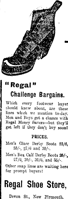 " Regal" Challenge Bargains. Which every footwear buyer should knew about, are these lines which we mention to-day. Men and Roys get a chance with Regal Money Savers—but they'll get left if they don't buy soon I PHICES. Men's Glaee Derby Boots 23/6, 25/-, 27/0 and *3O/-. Men's Box Calf Derby Boots 25/•, 27/6, 30/-, 32/6,' and 35/-. Other snap linos are waiting herei for prompt buyers! Regal Shoe Store, Devon St., New Plymouth,
