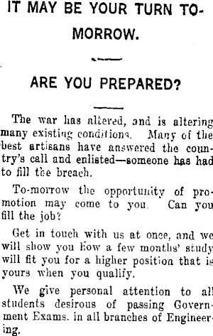 IT MAY BE YOUR TURN TOMORROW. ARE YOU PREPARED? The war lias altered, and is altering many existing conditions. Many of the best artisans have answered the country's call and enlisted—someone has had to fill the breach. To-morrow the opportunity of promotion may come to you. Can you fill the job? Get in touch with us at once, and we will show you how a few months' study will fit you for a higher position that is your 9 when you qualify. We give personal attention to all students desirous of passing Government Exams, in all branches of Engineering.