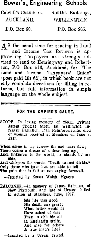 Bower's, Engineering Schools Colwill's Chambers, Routh's Buildings, AUCKLAND. WELLINGTON. P.O. Box 50. P.O. Box 865. the usual time for sending in Land and Income Tax Returns is approaching Taxpayers are strongly advised to send to Hemingway and Robertson, P.O. Box 516, Auckland, for "The Land and Income Taxpayers' Guide" (post paid 10s 6d), in which book are not only complete directions for filling in returns, but full information in simple language on the whole subject. FOR THE EMPIRE'S CAUSE. STOTT.—In loving memory of 2561 X, Private Jams# Thomas Stott, Ist Wellington Infantry Battalion, 17th Reinforcements, died of wounds received at Messlnes ou June 9, 1917. When alone in ray sorrow the sad teara flow; There comes a dream of a dear long ago. And, unknown to the world, he stands by my side, And whispers the words, "Death cannot divide." Only those who have lost are able to tell The pain Hint Is felt at not saying farewell, —lnserted by Emma Walsh, Ngaere. PALCONEE.—In memory of James Falconer, of New Plymouth, and late of Urenul, killed in action at Messlnes, June, 1917. His life was good His death was great; What better would he Hare asked of fate, Than to risk his all In England's strife, And give for others A true man's life f —lnserted by a Urenul friend.