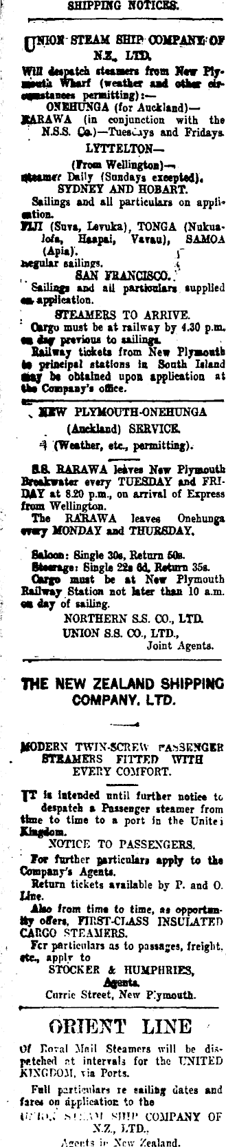 SHIPPING NOTICES: |THH» STEAM SHIP OOMPANTOF HZ. Lm Wiß despatch it«wn from Hew Ply■Mtk wkwf (weather and ate tite«astanees permitting) ONBHUNGA (for Auckland)— JtABAWA (in conjonction with the N.S.S. Co.)— Tuesdays and Fridays. LYTTELTON—(from Wellington)—, qttamrr Daily (Sundays excepted), SYDNEY AND HOBABT. Sailings and all particulars on appli* sntion. XXJI (Suva, Levuka), TONGA (Nukualofa, Haapai, Vavau), SAMOA (Apia). f l»egular Bailing. t san mxcisco.: Sailings and ail pantostat* supplied e» application. STEAMERS TO ARRIVE. Cargo must be at railway by 4.30 p.m. m &mm urtTioos to uilinn. BaUway tickets from New Plysovth to principal stations is South Island obtained upon application at IW Company's office. „ XXW PLYMOUTH-ONEHUNGA (Auckland) SERVICE. (Weather, etc, permitting). && RARAWA leires Hew Plymouth Breakwater every TUESDAY and FRIDAY at 8.20 p.m., on arrival of Express from Wellington. The RARAWA leaves Onehunea every MONDAY and THURSDAY. Saloon: Single 30s, Return 50b. Wastage: Single 22a fld. Return 355. Oargo most be at New Plymouth RaQway Station not later than 10 a.m. m day of sailing. NORTHERN SJS. CO., LTD. UNION S.S. CO , LTD, Joint Agents. THE NEW ZEALAND SHIPPING COMPANY. LTD. IfOOERN TWIN-SCREW PASSENGER STEAMERS FITTED WITH EVERY COSIFORT. IT la intended nntil further notice to despatch a Passenger steamer from time to time to a port in the Unite i Khgiom XOTICE TO PASSENGERS. Tor farther particular* apply to the Company's Agents. Return tickets available by P. and 0. line. Also from time to time, as opportunity offers, FIRST-CLASS INSULATED CARGO STEAMERS. Fcr particulars as to passages, freight, «te, applr to STOCK ER & HUMPHRIES, Amenta. Carrie Street, New Plymouth. ORIENT LINE Of Eoval Mnil Steamers will be dispatched pt interval* for the UNITED KINGDOM, \ia Ports. Fnll particulars re sailing dates and - fares on application to the wW 'I SHU' COMPANY OF X.Z., LTD.. /"ot'ts ir Xcw Zealand.