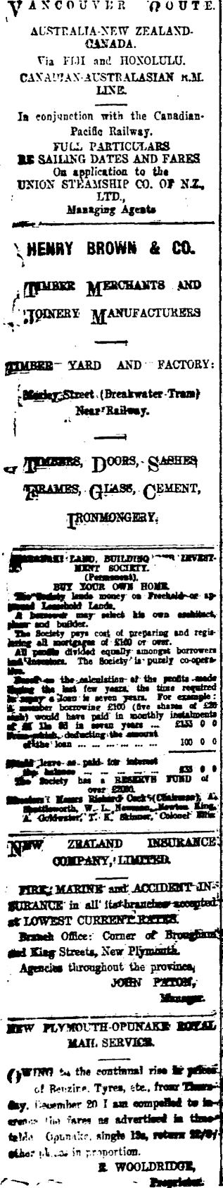 YAXCO UV U H OOUT E. AL'STEALTA-XEW ZEALANDCiSADA. Via FIJI and HOXOLULU. CAXAL*!AX AUSTRALASIAN K.IL USE. Ia conjunction with the CanadianPacific Railway. FULL PARTICULARS IS SAILING DATES AND FARES Oa application to tii* UNION STEAMSHIP CO. Of NX, LTD., Mutgiag Agesta \ HENRY BROWN & CO. jrjpißSß JJEBCHANTB AND -™n AND FACTORY: ' ntohiXjTtTrrt fffrmit-rnitTr Tnrrf Ncu'Saßwy. TjpMrass, pooas,- gAfiHß^ "FRAMES, QUA3B, £EMENT, UID, BUILOFBQ ■BIT SOdJCTT. BUT XODK OWI HO**. ** saner oa liiftolt nr ;-WMriv la MilmSbM mmr •«» ■* •"> HHlfcrti I Seetety p«T* cat at gregarisg and rtgi«- _» d mrifaai oTSMO or oar. AS poaAi <BtmM «qoeDy among* bamnren Mk<feaaataa. Tba Soeitty'U-purall Wm. |m|l« -tbe-iMlealattas-1»- the fuflta -mmS* Mm Mm M few J« tl» Una Mfatod B*Far«3oen l» mmjna. for tang)*: i. amber bonoviae £MO (arethmm ■MM weald ham mid in BOBthly iwaUlmwrta <VSi H ti aaaas jmt ~ OH • • m o o L. S3 I j|» (DdatT baa a BMBKTB IOTD ol ■•riant Kaaaa » WSSfti%4lßS®ste' 7BJtr.ATgl) niSTRANCB' nmfPitwv,' TTinnat aaC gOSANCK in all' lta*toael—' wiqttar «t LOWEST CUBBSnCJOOESK IMMfe office: Corner rf Brendan*! gHi Ki*j Streets, New Pljmusztk. AgndM tlironghout tie province jotw paraw, BTW HiYMOUTH-OPUKAK* Mfffi MAIL SERVHX. fjVnTO t* tfw wmtimjri riM of Tyrea, ste.. fro trtKr.y I ii.( fftrw as adiaiUaei la ttaW| ttM.< Oj»i.n i!;p, afngta Ma, (Uwr i.V.-l. in prinortion. ft WOOLDRIDOT,