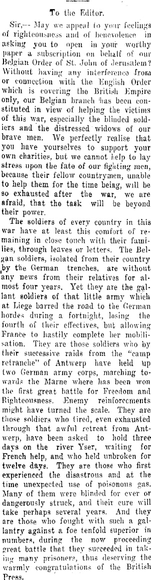 To the Editor. Sir, — May we appeal lo your feelings of righteousness and of benevolence in asking you to open in your worthy paper a, subscription on behalf of our Belgian Order of St. John of Jerusalem? Without having any interference from or connection with the English Order which is covering the British Empire only, our Belgian branch 'lias been constituted in view of helping the victims of this war, especially the blinded soldiers and the distressed widows of our brave men. We perfectly realise that you have yourselves to support your own charities, but we cannot help to lay stress upon the fate of our fighting men, because their fellow countrymen, unable to help them for the time being, will be so exhausted after the war, we are afraid, that the task will be beyond their power. The soldiers of every country in this war have at least this comfort of remaining in close touch with their families, through leaves or letters. The Belgan soldiers, isolated from their country Jay the German trenches, aie without any news from their relatives for almost four years. Yet they are the gallant soldiers of that little army which at Liege barred the road to tlie German hordes during a fortnight, losing the fourth of their effectives, but allowing France to hastily complete her mobilisation. They arc those soldiers who by their successive raids from the "camp relranche" of Antwerp have held Up two German army corps, marching towards the Marne where lias been won the first great battle for Freedom and Righteousness. Enemy reinforcements might have turned the scale. They are those soldiers who tired, even exhausted through that awful retreat from Antwerp, have been asked to hold three days on the river Yser, waiting for French help, and who held unbroken for twelve days. They are those who first experienced the disastrous and at the time unexpected use of poisonous gas. Many of them were blinded for ever or dangerously struck, and their cure will take perhaps several years. And they are those who fought with such a gallantry against a foe tenfold superior in numbers, during the now proceeding great battle that they succeeded in taking many prisoners, thus deserving the warmly congratulations of the British Press.
