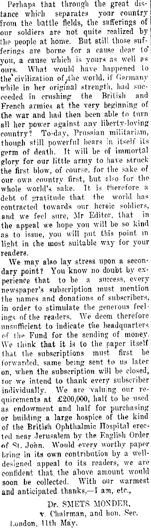 Perhaps that through the great distance whirli separates your country from the battle fields, the sufferings of our soldiers are not quite realized by the people at home. But still those sufferings are borne for a cause dear to' you, a cause which is yours as well as ours. What would have happened to the'civilization world, if Germany while in her original Rtrenjrt.li. had succeeded in crushing the British and French armies at the very beginning of the war and had then been able to turn all her power against any liberty-loving country? To-day, Prussian militarism, though still powerful hears in itself its germ of death. It will be of immortal glory for our little army to have struck the first blow, of course, for the sake of our own country first, but also for the whole world's sake. It is therefore a debt of gratitude that the world has contracted towards our heroic soldiers, and we feel sure, Mr Editor, that in the appeal we hope you will be so kind as to issue, you will put this point in light in the most suitable wiiy for your readers. We may also lay stress upon a secondary point? You know no doubt by experience that to be a success, every newspaper's subscription must mention the names and donations of subscribers, in order to stimulate the generous feelings of the readers. We deem therefore nnsufficient to indicate the headquarters of the Fund for the sending of money. We think that it is to the paper itself that the subscriptions must first be forwarded, same being sent to us later on, when the subscription will be closed, tor we intend to thank every subscriber individually. . We are 'valuing our requirements at £200,000, half to be used as endowment and half for purchasing or building a large hospice of the kind of the British Ophthalmic Hospital erected near Jerusalem by the. English Order of ''t. John. Would every worthy paper bring in its own contribution by a welldesigned appeal to its readers, we are confident that, the above amount would soon be collected. With our warmest and anticipated thanks,—l am, etc., Dr. SMETS MONGER, v. Chairman, and lion. Sec. London, 11th May.