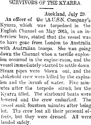 SURVIVORS-OP THE KYAERA. Auckland, July 2i). An officer of the ';A.U.S.N. Company's KyaTra, which was torpedoed in the English Channel on May 20th, in an interview here, stated that the vessel was to have gone from London to Australia with Australian troops. She was going down the Channel when a terrific explosion occurred in the engine-room, and the vessel immediately started to settle down Steam pipes were blown out, and the stokehold crew wore killed by the explosion and the inrush of water. Five minutes after the torpedo struck her the Kyarra filled. The starboard boats were lowered and the crow embarked. The vessel sank fourteen minutes after being iiit. The crew lost all their personal effects, but they were dressed. All were landed safely.