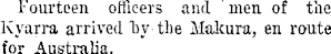 Fourteen officers and ' men of the Kyarra arrived hy the Mokura, en route for Australia.