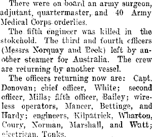 There were on hoard an army Burgeon, adjutant, quartermaster,, and 40 Army Medical Corps, orderlies. The. fifth engineer was killed in the stokehold. The third and fourth officers (Messrs Torquay and [Beck) left foy another steamer for Australia. The crew are returning (by another vessel. The officers returning now are: Capt. Donovan; chief officer, Wihite; se<K)nd officer, Stills;- fifth officer, Bailey; wireless operators, Mancer, Bettinge, and Hardy; engineers, Kilpatrlck, Wharton, Cour.y, Xorman, Marshall, and Watt; ■ elcctrican, Tonics.
