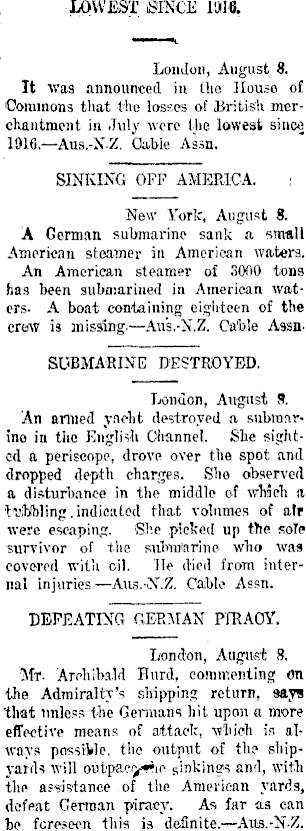 LOWEST SINCE 11)18, London, August 8. It was announced in the House of Commons that the losses of British merchantmen! in July wore the lowest since 1016. —Aus.-NZ. Cable Assn. SINKING OFF AMERICA. New York, August 8. A German submarine sank a small American steamer in American waters. An American steamer of 3000 tons has been submarined in American waters- A boat containing eighteen of the crew is missing-—Au's.-N.Z. Cable AssnSUBMARINE DESTROYED. London, August 9. An armed y.ioht destroyed a submarine in the English Channel. She sighted a periscope, drove over the spot and dropped depth charges. She observed a disturbance in the middle of wMeh a 'H'ibfbling.indicated that volumes of air were escaping. She picked up the sole survivor of the submarine who was covered with oil. He died from internal injuries—Aus.-N.Z. Cable Assn. DEFEATING GERMAN PIRACY. London, August 8. Mr. Archibald Furd, commenting on the Admiralty's shipping return, says that unless the Germans hit upon a more effective means of attack, which is always possible. the output of the shipyards will sinkings and, with the assistance of the American yards, defeat German piracy. As far as can be foreseen this is definite.—Aus.-N-Z.