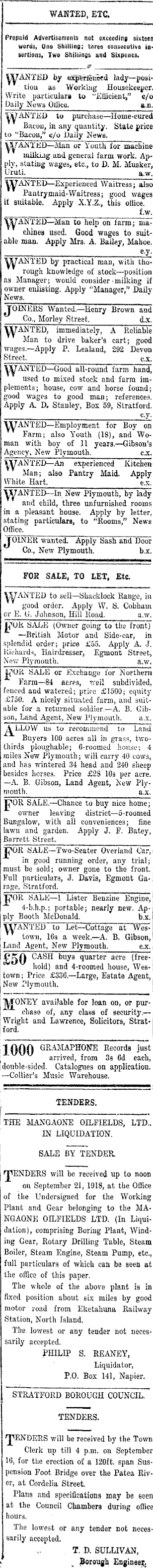 WAHTED, ETC. J sortions, Two Shillings and Sixpence. WANTED by experienced lady—position as Working Housekeeper. Write particulars to "Efficient," c/o Daily News Office, a.n. WANTED to purchase—Home-cured Bacon, in any quantity. State price to '•Bacon," e/o Daily News. WANiED—Man or Youth for machine nulkiug and general farm work. Apply, stating wages, etc., to D. M. Musker, Uruti. a.w. [ WANTED—Experienced Waitress; also Pantrymaid-Waitress; good wages if suitable. Apply X.Y.Z., this office. tw. WANTED—Man to help on farm; machines used. Good wages to suitable man. Apply Mrs. A. Bailey, Mahoe. e.y. WANTED by practical man, with thorough knowledge of stock—position as Manager; would consider'milking if owner enlisting. Apply "Manager," Daily News. JOINERS Wanted—Henry Brown and I Co., Morley Street. 6.x.. WANTED, immediately, A Reliable Man to drive baker's cart; good wages.—Apply P. Lealand, 292 Devon Street. C .X. WANTED—Good all-round farm hand, used to mixed stock and farm implements; house, cow and horse found; good wages to good man; references. Apply A. D. Stanley, Box 59, Stratford. WANTED—Employment for Boy on Farm; also Youth (18), and Woman with boy of 11 years.—Gibson's Agency, New Plymouth. ex. WANTED—An experienced Kitchen Man; also Pantry Maid. Apply White Hart. e.x. WANTED—In New Plymouth, by lady and child, three unfurnished rooms in a pleasant house. Apply by letter, stating particulars, to "Rooms," News Office. TOINER wanted. Apply Sash and Door Co., New Plymouth. bx FOR SALE, TO LET, Etc. WANTED to sell—Suacklock Range, in good order. Apply W. S. Cobham or E. G. Johnson, Hill Road. a.w. jPOK SALE (Owner going to the front) —British Motor and Side-car, in splendid order; price £55. Apply A. J. Richards, Hairdresser, Egmont Street, New Plymouth. a.w. LHJIi bALE or Exchange for Northern Farm—B4 acres, tveil subdivided, fenced and watered; price £1500; equity £750. A nicely situated far able for a returned soldier. —A. B. Gibson, Land Agent, New Plymouth. a.x. A LLOVV us to recommend to Land Buyers 100 acres all in grass, twothirds ploughable; G-roomed house; 4 miles New Plymouth; will carry 40 cows, and has wintered 34 head and 240 sheep besides horses. Price £23 10s per acre. —A. B. Gibson, Land Agent, New Plymouth, n.x. SALE.—Chance to buy nice home; owner leaving district —5-roomed Bungalow, with all conveniences; fine lawn and garden. Apply J. F. Batey, Barrett Street. JpOR SALE—Two-Seater Overland Car, in good running order, any trial; must be sold; owner gone to the front. Full particulars, J. Davis, Egmont Garage, Stratford. TJHIR SALE—I Lister Benzine Engine, 4-b.h.p.; portable; nearly new. Apply Booth McDonald. b.x. WANTED to Let—Cottage at Westown, 16s a week.—A. B. Gibson, Land Agent, New Plymouth. c.x. £KA CASH buys quarter acre (freehold) and 4-roomed house, Westown; Price £33o.—Large, Estate Agent, New Plymouth. TMTONEY available for loan on, or purchase of, any class of security.— Wright and Lawrence, Solicitors, Stratford. J 000 GRAMAI,HONE Records just arrived, from 3s 6d each, double-sided. Catalogues on application. —Collier's Music Warehouse. THE MANGAONE OILFIELDS, LTD., IN LIQUIDATION. SALE BY TENDER. HHENDERS will be received up to noon on September 21, 1918, at the Office of the Undersigned for the Working Plant and Gear belonging to the MANGAONE OILFIELDS LTD. (In Liquidation), comprising Boring Plant, Winding Gear, Rotary Drilling Table, Steam Boiler, Steam Engine, Steam Pump, etc., full particulars of which can be seen at the office of this paper. The whole of the above plant is in fixed position about six miles by good motor road from Eketahuna Railway Station, North Island. The lowest or any tender not necessarily accepted. PHILIP S. REANEY, Liquidator, P.O. Box 141, Napier. , STRATFORD BOROUGH COUNCIL. 'TENDERS will be received by the Town Clerk up till 4 p.m. on September 10, for the erection of a 120 ft. span Suspension Foot Bridge over the Patea River, at Cordelia Street. Plans and specifications may be seen at the Council Chambers during office hours. The lowest or any tender not necessarily accepted. T. D. SULLIVAN, Borough Engineer^