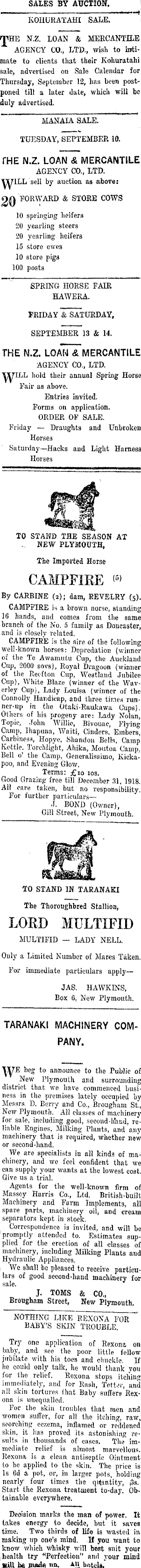 SALES BY AUCTION. KOHURATAHI SALE. "TOE N.Z. LOAN & MERCANTILE " AGENCY CO., LTD., wish to intimate to clients that their Kohuratahi sale, advertised on Sale Calendar for Thursday, September 12, has been postponed till a later date, which will be duly advertised. MANAIA SALE. TUESDAY, SEPTEMBER 10. THE N.Z. LOAN & MERCANTILE AGENCY CO., LTD. TXfILL sell by auction as above: 20 FORWARD & STORE COWS 10 springing heifers 20 yearling steers 20 yearling heifers 15 store ewes 10 store pigs 100 posts SPRING HORSE FAIR HAWERA. FRIDAY & SATURDAY, SEPTEMBER 13 & 14. THE N.Z. LOAN & MERCANTILE AGENCY CO., LTD. \XfILL hold their annual Spring Horse Fair as above. Entries invited. Forms on application. ORDER OF SALE. Friday Draughts and Unbroken Horses Saturday—Hacks and Light Harness Horses TO STAND THE SEASON AT NEW PLYMOUTH, The Imported Horse CAMPFIRE < s > By CARBINE (2); dam, REVELRY (5). CAMPFIRE is a brown norsc, standing 16 hands, and comes from the same branch of the No. 5 family as Doncaster, and 13 closely related. CAMPFIRE is the sire of the following well-known horses: Depredation (winner of the Te Awamutu Cup, the Auckland Cup, 2000 sovs), Royal Dragoon (winner of the Recfton Cup, Westland Jubilee Cup), White Blaze (winner of the Waverley Cup), Lady Louisa (winner of the Connolly Handicap, and three times run-ner-up in the Otaki-Raukawa Cups). Others of his progeny are: Lady Nolan, Topic, John Willie, Bivouac, Flying Camp, Ihapuna, Waiti, Cinders, Embers, Carbiness, Hopye, Shandon Bells, Camp Kettle, Torchlight, Ahika, Moutoa Camp, Bell 0' the Camp, Generalissimo, Kickapoo, and Evening Glow. Terms: £lO 10s. Good Grazing free till December 31, 1918. All care taken, but no responsibility. For further particulars— J. BOND (Owner), Gill Street, New Plymouth. TO STAND IN TARANAKI The Thoroughbred Stallion, LORD MULTIFID MULTIFID LADY NELL. Only a Limited Number of Mares Taken. For immediate particulars apply— JAS. HAWKINS, Box 0, New Plymouth. TARANAKI MACHINERY COMVy'E beg to announce to the Public of New Plymouth and surrounding district that we have commenced business in the premises lately occupied by Messrs. D. Berry and Co., Brougham St., New Plymouth." All classes of machinery for sale, including good, second-h'aud, reliable Engines, Milking Plants, and any machinery that is required, whether new or second-hand. We are specialists in all kinds of machinery, and we feel confident that we can supply your wants at the lowest cost. Give us a trial. Agents for the well-known firm of Massey Harris Co., Ltd. British-built Machinery and Farm Implements, all spare parts, machinery oil, and cream separators kept in stock. Correspondence is invited, and will be promptly attended to. Estimates supplied for the erection of all classes of machinery, including Milking Plants and Hydraulic Appliances. We shall be pleased to receive particulars of good second-hand machinery for sale. J. TOMS & CO., Brougham Street, New Plymouth. NOTHING LIKE REXONA FOR BABY'S SKIN TROUBLE. Try one application of Rexona, on baby, and see the poor little fellow jubilate with his toes and chuckle. If he could only talk, he would thank you for the relief. Rexona stops itching immediately, and for Rash, Tetter, and all skin tortures that Baby suffers Rexona is unequalled. For the skin troubles that men and women suffer, for all the itching, raw, scorching eczema, inflamed or reddened skin, it has proved its astonishing results in thousands of cases. The immediate relief is almost marvellous. Rexona is a clean antiseptic Ointment to be applied to the skin. The price is Is Od a pot, or, in larger pots, holding nearly' four times the quantity, j3s. Start the Rexona treatment to-day. Obtainable everywhere. Decision marks the man of power. It takes energy to decide, hut it saves time. Two thirds of life is wasted in making up one's mind. H you want to know which whisky will best suit your health try "Perfection" and your Will be mode nn. All hotels.