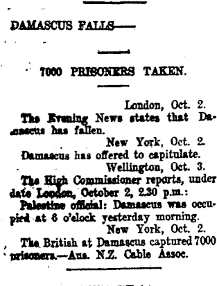 DAMASCUS FALLS • ' TOW PRBSONBtS TAKEN. London, Oct 2. fat Jtvautog News states that Dadaseus has fallen. New York, Oct. 2. Damascus has offered to capitulate. Wellington, Oct 3. The High Commitsioßer reports, under date LeSfc, October 2, 240 pjn.-. Palestine official: Damascus was occupied at « o'clock yesterday morning. New York, Oct 2. , The. British at Damascus captured 7000 • wisoaers.—Aus. NX Cable Assoc.