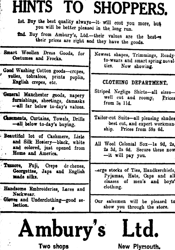 HINTS TO SHOPPERS. Ist Buy the best quality always-it- will cost you more, but you will be better pleased in the. long run. fad. Buy from Ambury's, Ltd.-their values are the best-* their prices are right and they have the goods. Smart Woollen Dress Goods, for Costumes and Frocks. Good Washing Cotton goods—crepes, ' voiles, tobralcos, prints poplin, English crepes, etc. General Manchester goods, napery furnishings, sheetings, damasks —<U far below to-day's values. Chatments, Curtains, Towels, Drills —all below to-day's buying. • Beautiful lot of Cashmere, lisle and Silk Hosiery—black, white . and colored, just opened from i.. . .Home and America. Tusore, Fuji, Crepe dechenes, Georgettes, Japs and English made silks. Handsome Embroideries, Laces and Neckwear. • Gloves and Underclothing—good selection. Newest shapes, Trimmings, Ready-to-wears and smart spring novelties. Now showing. CIOTHING DEPARTMENT. Striped Neglige Shirts—all sizeswell cut and roomy. Prices from 3s lid. Tailor-cut Suits—all pleasing shades •best cut, and expert workmanship. Prices from 59s 6d. All Wool Colonial Sox—la 9d, 2s, 2s 3d, 2s 6d. Secure these now —it will pay you. -arge stocks of Ties, Handkerchiefs, Pyjamas, Hats, Caps and all classes of men's and boys' clothing. Our salesmen will be pleased to show you through the Btore. Ambury's Ltd. Two shops New Plymouth.