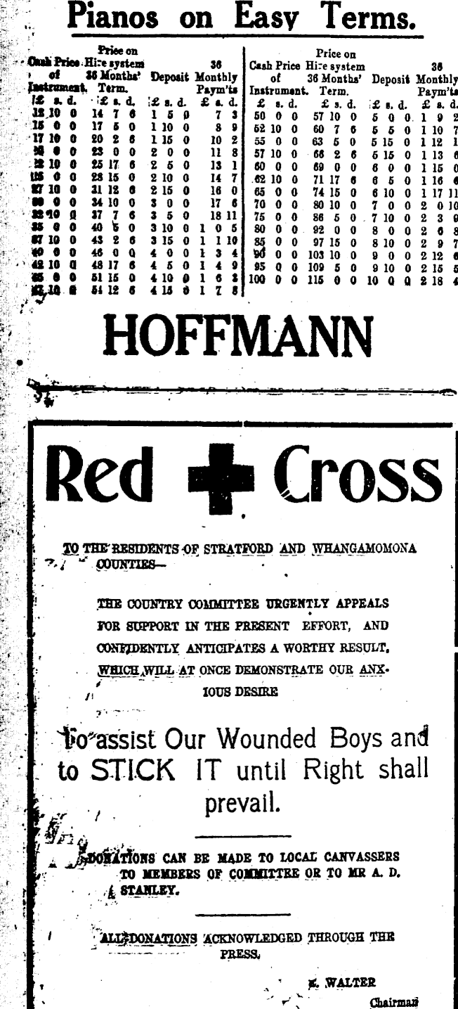 Pianos on Easy Terms. Ptieeon - Ota* Ptlee Hire system 38 • «f M Months' Deposit Monthly Ittraneit. Ttrm. Paym'te W M. d. •!£s. d, !£ a. d. £•. d. M.lO I II 7 ( 1 i« 73 15 00 17 SO 110 0 89 1710 0 SO 2 8 116 0 10 2 MtOSSOOZOO 11 8 *lO 0 25 17 8 25 0 IS 1 U5 0 0 28 15 0 210 0 14 7 IT 10 0 31 12 8 215 0 16 0 NOO 34 10 0 300 17 8 - SS4O fl 37 7 8 3 5 0 18 11 WOO 40 5 0 310 0106 91 10 0 43 2 8 315 0 1 119 49 00 4800 400134 4810 0 48 17 8 450149 WOO 51 15 0 410 0 1 8 3 ■"•*» M i 6112 5 4UOIZB Price on Cuh Price Hire system 38 of 36 Months' Deposit Monthly Instrument. Term. P&ym'ts £ s. d. £s. d. \£ s. d. £s. d. 60 0 0 57 10 0 5 0 0 19 2 62 10 0 6076 6601 10 7 5500 6350 515 01 12 1 57 10 0 68 2 6 615 0 113 6 60 0 0 69 00 6001 15 0 62 10 0 71 17 6 6 6 0 116 4 85 0 0 74 15 0 610 0 117 11 70 00 80 10 0 70020 10 75 00 86 50. 710 0236 80009200 800208 3 0 0 97 15 0 810 0 2 9 7 0 0 103 10 0 9 0 0 212 6 95 Q 0 109 6 0 910 0 215 5 100 0 0 115 0 0 10 0 Q 2 18 4 HOFFMANN fOTHgBESIDENTS<>F STEATFORD AND WfciNGAMOMONA ■/ "" COUNTIES—- ! THE COUNTRY COMMITTEE URGENTLY APPEALS FOB SUPPORT IN THE PRESENT EFFORT, AND CONFIDENTLY ANTICIPATES A WORTHY RESULT. ymcHjynji at once demonstrate our anx- ,,' IOUSDESHU3 r . ' I?o*assist Our Wounded Boys and . to STICK IT until Right shall ~( ■ prevail. I a Jwwuilbw' can be made to local canvassers L- m *" TO MEMBERS OF COMMUTES OR TO MR A. D. f ■ . £ STANLEY. AIIgPONATIONS ACKNOWLEDGED THROUGH THE : '.:_::._;.„. " -gsxss, £ WALTER "' r 1 ' Cbairauui
