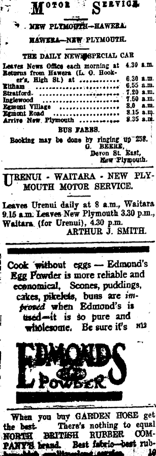 1 . «W PLTMCHHfa-HAWEBA EAWBBA—NBW PLYMOUTH. TBS DAILY HEWSfBPBCIAI. CAB leafei News Offlea eaeo moraine tt 4.30 t.m. Batons from Btwan (It 0. Hookert. High St) at ....- 630 a.m. lUhim 8.53 aj» Stratford. _v—r-~ ■ *■*• *- ! it VHlai« 8.0 a.m. Vgmoot Boad ••• 8.15 a.m. Antra »t». Plymouth ....„-.,.. 8.35 a.oL BUS rABBB. ' BaoUat «*» U dons by rtoeine ttt»"2Bß.' 0. BXBBX, Oeron 8t But, Hew-Plymouth. ■*■' MOUTH MOTOR SERVICE. Leaves Urenui daily at 8 a.m., Waiter* 9.15 am: Leaves New Plymouth 3.30 p.m., Waitaia. (for Urenui), 430 pjn. ARTHUR J. SMITH. Cook without eggs Edmond's Egg Powder is more reliable and economical, Scones, puddings, cakes, pftelete, buas are improved when Edmond's is ttsed~<it is so pore and wholesome, Be sure if s «« When yon buy GABDEN HOSE get the bast- There's nothing to equal HORTH BRITISH RUBBER 00MPAHTS brand. Best Wfic-^ertWh-