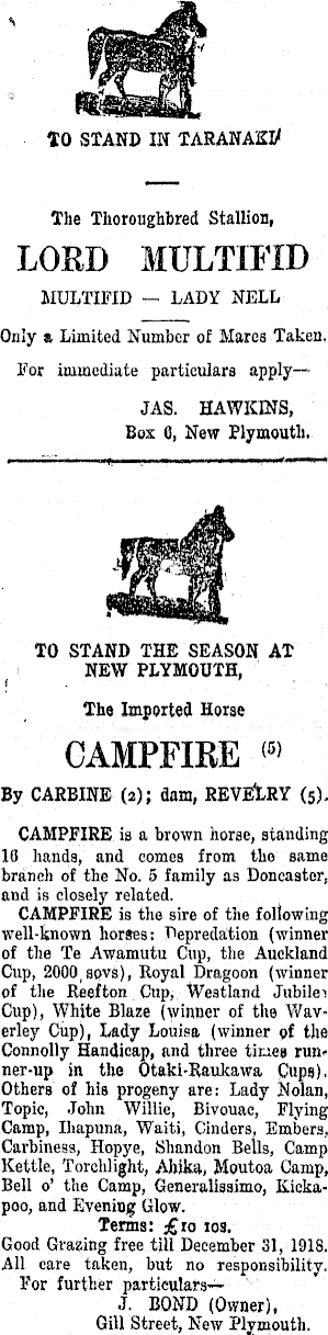 to STAND IN TARANAKtf The Thoroughbred Stallion, LORD MULTIFID MULTIFID LADY NELL Only & Limited Number of Mares Taken. For immediate particulars apply— JAS. HAWKINS, Box 0, New Plymouth. TO STAND THE SEASON AT NEW PLYMOUTH, The Imported Horse CAMPFIRE (5) By CARBINE (2); dam, REVEtRY (5), CAMPFIRE is a brown horse, standing 16 hands, and comes from tlio same branch of the No. 5 family as Doncaster, and is closely related. CAMPFIRE is the sire of the following well-known horses: depredation (winner of the Te Awamutu Cup, the Auckland Cup, 2000, spvs), Royal Dragoon (winner of the Reefton Cup, Westiand Jubilei Cup), White Blaze (winner of the Waverley Cup), Lady Louisa (winner of the Connolly Handicap, and three times run-ner-up in the Otaki-Raukawa Cups). Others of his progeny are: Lady Nolan, Topic, John Willie, Bivouac, Flying Camp, Ihapuna, Waiti, Cinders, Embers, Carbiness, Hopye, Shandon Bells, Camp Kettle, Torchlight, Ahika, Moutoa Camp, Bell o' the Camp, Generalissimo, Kickapoo, and Evening Glow. Terms: £lO 10s. Good Grazing free till December 31, 1918. All care taken, but no responsibility. For further particulars— J. BOND (Owner), Gill Street, New Plymouth.