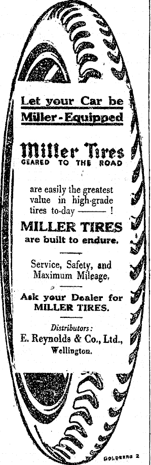Let your Car be Miller • Equipped tlllller Tim GEARED TO TH| ROAD are easily the greatest value in high-grade tires to-day ! MILLER TIRES are built to endure. Service, Safety, and Maximum Mileage, Ask your Dealer for MILLER TIRES. Distributors: E. Reynolds & Co,, Ltd., Wellington. m
