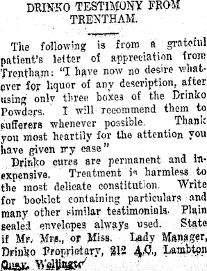 KRTCKO TESTIMONY FROM TRENTHAM. The following is from ft grateful patient's letter of appreciation from Trentham : "I have now no desire whatever for liquor of any description, after using onlv three boxes of the Drinko Powders. I will recommend them to sufferers whenever possible. Thank you most heartily for the attention you have given iry ease " Drililco cures are permanent and Hiexpensive. Treatment ii harmless to the most delicate constitution. "Write for booklet containing particulars and many other similar testimonials. Plain sealed envelopes always used. State if Mr, Mrs., or Miss. Lady Manager, Driiilio proprietary, 812 , Lainbtpn .Qua*.