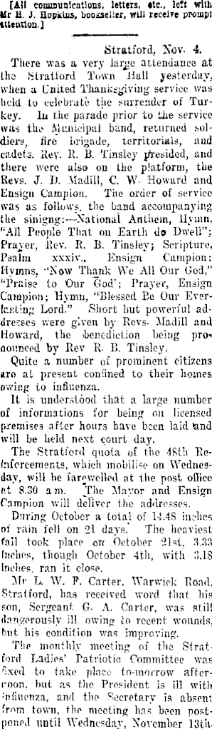 [All communications, letters, etc., left with Br u. J. Hopkins, booKaeUer, will recelre prompl illtntlon.} Stratford, 2Cov. 4. There was a very large attendance at tlia Stratford Town Hall yesterday. when a United Thanksgiving service was held to celebrate the surrender of Turkey. In the parade prior to the service was the Municipal band, returned soldiers, fire brigade, territorials, and cadef.3. Key. R. B. Tinsley presided, and there were also on the platform, the Revs. J. J). Madill, C. W Howard and Ensign Campion. Tiie order of service was as follows, the band accompanying the sinigng:—National Anthem, Hymn, "All People That on Earth do Dwell": Pravcr, Rev. R. B. Tinsley; Scripture, Psalm xxxiw. Ensign Campion; Hymns, 'Now Thank We All Our God," '•Praise to Our God'; Prayer, Ensign Campion; Hymn, "Blessed Be Our Everlasting Lord." Short but powerful addresses were given by Revs. Madill and Howard, the benediction being pro* aouneed by Rev R. B. Tinsley. Quite a number of prominent citizens urn at present coniined to their ho:nes owing to influenza. It is understood that a large number of informations for being on licensed premises after hours have been laid land will be held next court day. The Stratford quota of the 4fith Reinforcements, which mobilise on Wednesday, will be farewclled at the post office ftt 8.30 am. TJie Mayor and Ensign Campion will deliver the addresses. During October a total of 14.4S inches 01 rain fell on 21 days." The heaviest fall took place on October "21st, 3.33 Inches, though October 4th, with 3.18 Inches, ran it close. Mr L. W. P. Carter. Warwick Road, Stratford, has received word that his son, Sergeant G. A. Carter, was still dangerously ill. owing to recent wounds, but his condition was improving. The monthly meeting of the Stratford Ladies' Patriotic Committee was fixed to take place to-morrow afternoon, but as the President is ill with •nfiuenza, and the Secretary is absent, from town, the meeting has been postponed until Wednesday, November 13tU-