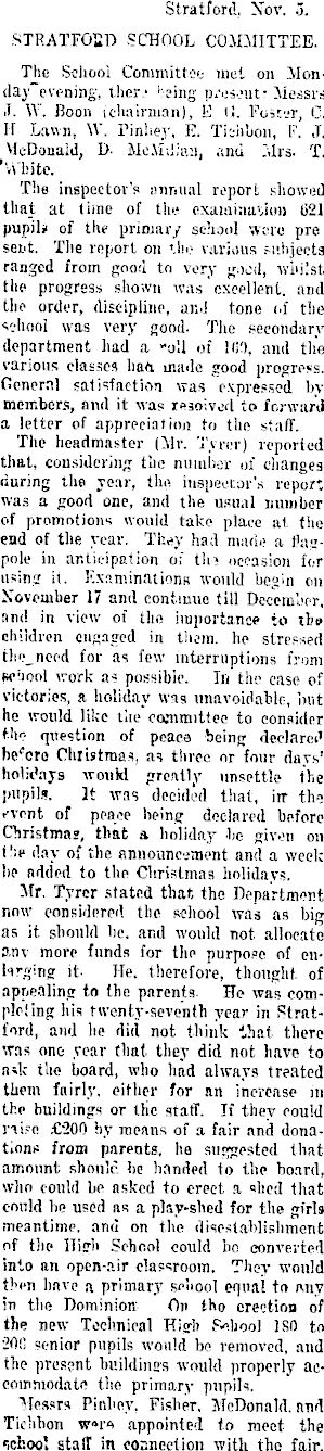 Stratford. Xov. 5. STRATFOSB SCHOOL COMMITTEE. The School Committee met on Monday~evening, ther.' '/sing p.-esout- Messrs J. W. Boon ichairnian), E U. Foititr, C. IT Lawn, W. Pinliey, E. Tishbon, F. J. Vic-Donald, D. McAldiaa, .end Mrs. T. " V\ hito. The inspector's unnual report showed that at time of the examination 1521 pupil* of the primary school were pre sett. The report on '.ho various subjects ranged from good to very (roixl, whilst the progress shown was excellent, and the order, discipline, and tone of the school was very good. The secondary department had a -oil of KiO, and the various classes hao. made good progress. General satisfaction was expressed by members, and it was resolved to forward a letter of appreciation to the staff. The headmaster (Mr. Tyrcr) reported that, considering the number of changes during the year, the inspector's report was a good one, and the usual number of promotions would take place at {lie end of the year. They had marie a flagpole in anticipation of th? occasion for using ii. Examinations would begin cm Xovoaiber 17 and continue till December, and in view of the importance to tbt> children engaged in them, he stressed the_need for as few interruptions from school work as possible. Ik the case of victories, a holiday was unavoidable, but he would like tiie committee to consider the- question of peace being declares' be'ere Christmas, as three or four days' holidays would greatly unsettle the pupils. It was decided that, irr the r-vent of peace being declared before Christina?, that a holiday be given on V:e day of the announcement and a week be added to the Christmas holidays. Mr. Tyrcr stated that the Department now considered the school was as big as it. should be. and would not allocate anv more funds for the purpose of enlarging it- He. therefore, thought, of appealing to the parents. He was completing his twenty-seventh year in Stratford, and he did not think ilat there was one year that they did not have to a*lc the board, who had always treated them fairly, either for an increase m the buildings or the staff. If they could ni.-c £2OO by means of a fair and donations from parents, ha suggested that amount should be banded to the board, who could be asked to erect a shed that could be used as a play-shed for the girls meantime, and on the disestablishment of the High School could bo converted into an open-air classroom. They would then have a primary school equal to cny in the Dominion On tho erection of the new Technical High Mioo) ISO to •200 senior pupils would be removed, and the present buildings would properly accommodate the primary pupils. Messrs Pinliey, Fisher. McDonald, and Ticlibon w«ri appointed to meet the ■school stalT in connection with the fair.