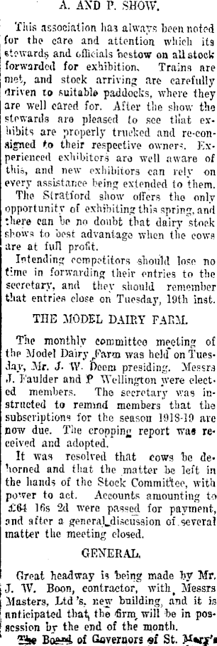 A. AND P. SHOW. This association has always been noted for the caro and attention which its stewards and officials bestow on all stock forwarded for exhibition. Trains are met, and stock arriving art carefully driven to suitable paddocks, where they are well cared for. After the show the stewards aro pleased to see tliat exhibits are properly trucked and re-eon-signed to their respective owner?. Experienced exhibitors aro well aware of this, and new exhibitors can rely on every assistance being extended to "them. The Stratford show offers the only opportunity of exhibiting this spring, and there can be no doubt that dairy stock shows to best advantage when the eows are at full profit. Intending competitors should lose no time in forwarding their entries to the secretary, and they should remember that entries close on Tuesday, 19th inst. THE MODEL DAIRY FARM. The monthly committee meeting of the Model Dairy /arm was held* on Tuesday, Mr. J. W- Deem presiding. Messrs •T. Faulder and P Wellington were elected members. The secretary was instructed to remind members that the subscriptions for the season 1918-19 are now due. The cropping report was received and adopted. It was Tcsolved that cows be dehorned and that the matter be left in the hands of the Stock Committee, with po'-ver to act. Accounts amounting to £64 Ifis 2d were passed for payment, snd after a generaljliscussion of several matter the meeting closed. GENERAL. Great headway is being made by Mr, j J. W. Boon, contractor, with, Messrs I Masters, Ltd % new building, and it is i anticipated thatj the firm, will he in pos- ] session by the end of the month. 23» Bo« 4 of Governors of St. l^vf'i