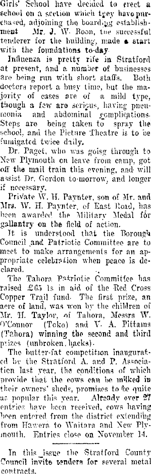 Girls' School have decided to erect a school on a section which tjfey have parc.'iased, adjoining the boarding establishment Mr. J. W- Boon, tue successful, tenderer for the building, made t, start with the foundations to-day Influenza is pretty rife in Stratford at present, and a number of businesses are being run With short staffs. Both doctors report a busy time, but the majority of cases ore of a mild type, though a few are- serious, having pneumonia and abdominal .complicationsSteps are being taken to spray the school, and the Picture Theatre is to be i'uiiiigatc-d twice daily. Dr. Paget, who was goisg through to New Plymouth on leave from camp, got off the mail train this evening, and will assist Dr. Gordon to-morrow, and longer if necessary. Private \V. H. Paynter, son of Mr. and Mrs. W. H. Paynter. of East Road, has been awarder', thp Military Medal for gallantry on the field of action. It is understood that the Borough Council and Patriotic Committee are to meet to make arrangements for an appropriate celebrr-tion when peace is declared. The Tahora Patriotic Committee has raised £OS Is in aid of the Red Cross Copper Trail fund. The first prize, an acre of land, was won by the children of Mr. 11. Taylor, of Tahora, Messrs W. O'Connor (Toko) and V. A. Pittams (Tahora) winning tho second and third prizes (unbroken.hacks). Tho butter-fat competition inaugurated hv the Stratford A. and P. Association last year, lha conditions of which provide that the cows can be m'dked in their owners' shed?, promises to foe quite ar. popular this year. Already over 27 entries have been received, cows having Ven entered from the district extending from Hawern. to YVnitara and New Plymonth. Entries close on November 14. Tn this__issue the Stratford County Council invite wnders for several metal contracts.