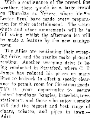 With :i continuance of ttie present fine weather, there be a laTge crowd on Thursday at jfgsero-. where Me-*-s Lester Bros, have made every preparation for their entertainment- The water chute and other amusements will he in fill l , swing, whilst the afternoon tea will t"> made a feature by the new management. The Allies are continuing their sweeping drive, and the results make pleasant readin" Another sweeniner drive is -being conducted in Stratford, where C. E ■Tames has reduced his prices on many li'its to hpdrork to effect a speedy clearance to permit room for Christmas goods Th ; s is your opportunity to secure Mies' handbarrs bangles, bracelets, toys, stationerr. and tliose who enjoy asmoke will fmd the biggest and best, range of e'ears, tobacco, and pipes in town.— Advt.