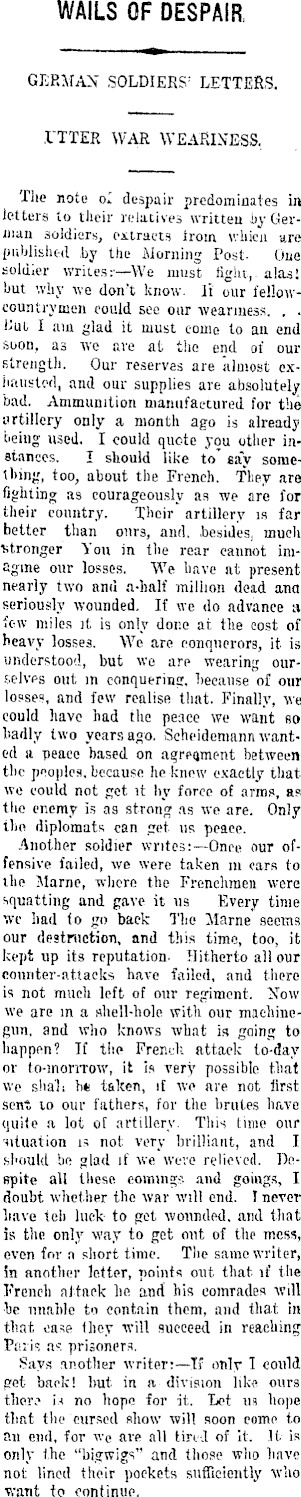 WAILS OF DESPAIR, GERMAN SOLDIERS' LETTERS. .UTTER WAR WEARINESS, The note despair predominates in letters to their relatives written by German soldiers, extracts irom v.'liicii are published by the Morning Post- One soldier writes:-—We must light,, alas! but why we don't know. It our fellowcountrymen could see our Avearmess. . . iJut I am glad it must come to an end soon, as we are at the end of our strength. Our reserves are almost exhausted, and our supplies are absolutely bad. Ammunition manufactured for the artillery only a month ago is already being used. I could quote you other instances. I should like to* say something, too, about the French. Tliey are fighting as courageously as we are for their country. Their artillery is far better than ours, and. .besides, mucli stronger Von in the rear cannot imagine our losses. We have at present nearly two and a-half million dead ana seriously wounded. If we do advance a few miles it is only done at the cost of heavy losses. We are conquerors, it is understood, but we are wearing ourselves out in conquering, because of onr losses, and few realise that. Finally, we could have had the peace we want so 'badly two years ago. Scheidemann wanted a peace based on agreqment between the peoples, because he knew exactly that we could not get it by force of arms, as the enemy is as strong as we are. Only the diplomats can get us peace. Another soldier writes:—Once our offensive failed, we were taken in cars to the Marne, where the Frenchmen were squatting and gave it us Every time |we had to go back The Marne seems our destruction, and this time, too, it kept up its reputation. Hitherto all our counter-attacks have failed, and there is not much left of our Tegiment. Now we are in a shell-hole with our machinegun, and who knows what is going to happen? If the French attack to-day or to-morrrow, it is very possible that wc sha'l: b* taken, if we are not first sent to our fathers, for the brutes have quite a lot of artillery. This time our situation is not very brilliant, and I should be glad if we were relieved. Despite all these coming;, and goings, I doubt whether the war will end. I never have teii luck to get wounded, and that is the only way to get out of the mess, even for n short time. The same writer, 5n another letter, points out that, if the French attack he and his comrades will he unable to contain them, and that in that, case I hey will succeed in reaching Paris as prisoners. Says another writer:—lf only I could got back! but. in a division like ours thcro is no hope for it. Let us hope that the cursed show will soon come to an end, for we are all tired of it. It. is only the "bigwigs" and those who have not lined their pockets sufficiently who want to continue.