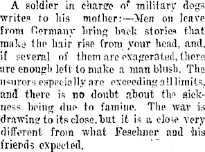 A soldier in charge o 1 " military dogs writes to his mother: —Men on leave from Oermanr hring biok stories that make; the hair rise from your head, and, if several of them are cxagerated, there tire enough left to make a man blush. The usurers especially arc exceeding all limits, and there is no doubt about th(> sickness being due to famine. The war is drawing to its close,but it is a clow very different from what Fesehner and his friends expected,
