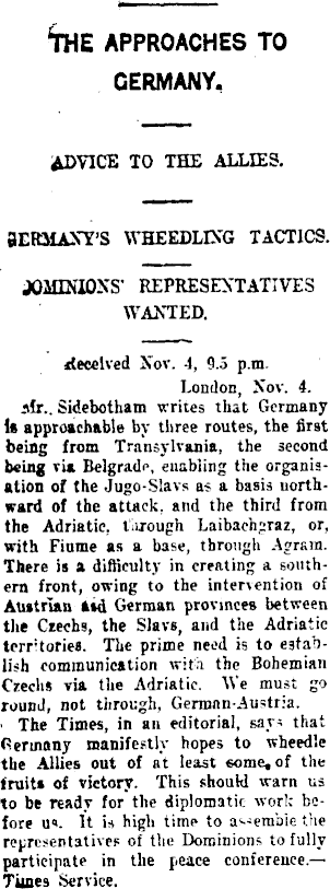 'the approaches to GERMANY, ADVICE TO THE ALLIES. BERMAXTS WHEEDLING TACTICS. JOMEOOXS- REPRESENTATIVES WANTED. rfecelved Nor. 4, 9.5 p.m. London, Nov. 4. afr.. Sidebotham writes that Germany Is approachable by three routes, the first being from Transylvania, the second being via Belgrade, enabling the organisation of the Jugo-Slavs as a basis northward of the attack, and the third from the Adriatic, through Laibaehgraz, or, with Fiume as a base, through Agr&m. There is a difficulty in creating a southern front, owing to the intervention of Austrian aid German provinces between the Czechs, the Slavs, and the Adriatic territories. The prime need is to establish communication with the Bohemian Czechs via the Adriatic. We must go round, not through, German-Austria. ■ The Times, in an editorial, say that ' Germany manifestly hopes to wheedle j the Allies out of at least some, of the ' fruit* of victory. This should warn us to be ready for the diplomatic work before u«. It is high time to assemble the representatives of the Dominions to fully i participate in the peace conference. — | Times Service.