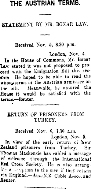 THE AUSTRIAN TERMS. STATEMENT BY MR. BOXAR LAW. Received Nov. 5, 8.30 p.m. London, Nov. 4. In the House of Commons, Mr. Bonar Law stated it was not proposed to proceed with the Emigration Bill this season He hoped to be able to read the wiiyu/'erms of the Austrian armistice on tie dth. Meanwhile, he assured the Home it would be satisfied with the Uruu.—Reuter. RETURN OF PRISONERS FROM TURKEY. Received Nov. fi, 1.30 a.m. London, Nov- 5. Tn view of the early return of Hew Zealand prisoners from Turkey. Sir Thomas Mackenzie has cabled a message of welcome through the International Red Cross Society. He is also arrang m;.- a e.vption to the men it thev reti.rn via England.—Aus.-N.Z Cable A ? soc. and R*uter-